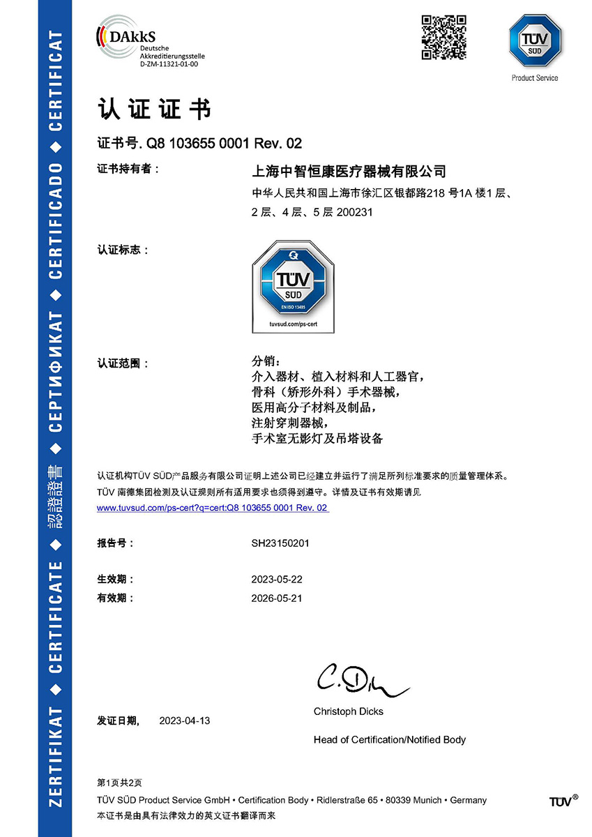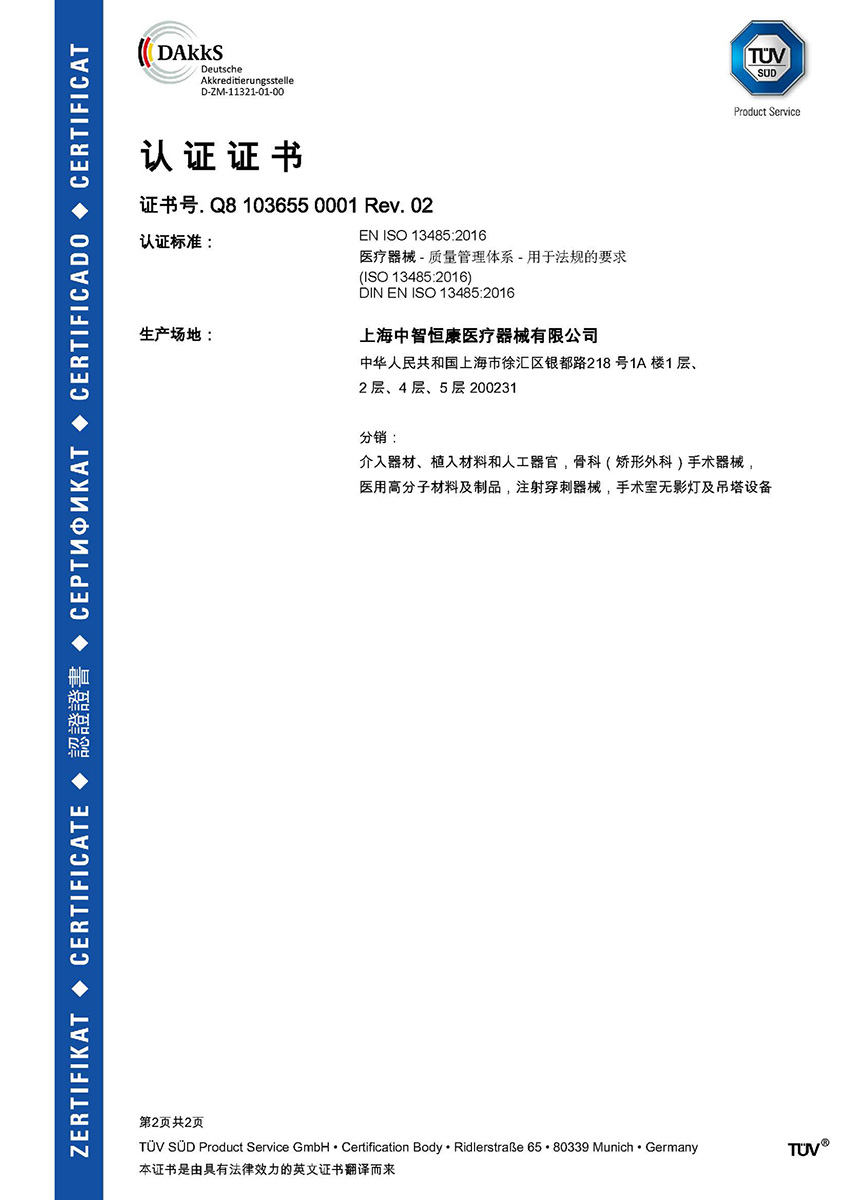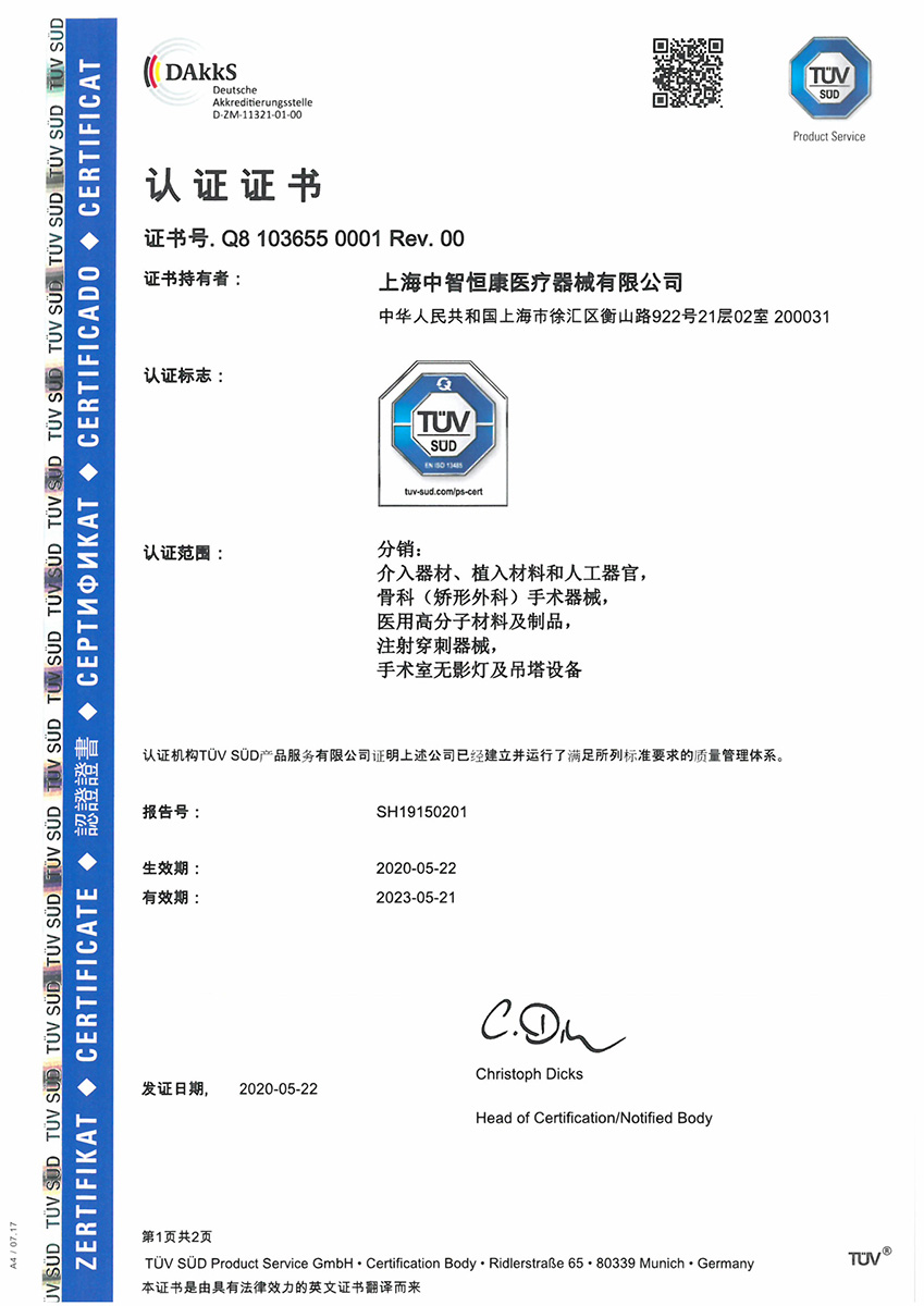 获得TUV续发的ISO 13485质量体系认证证书