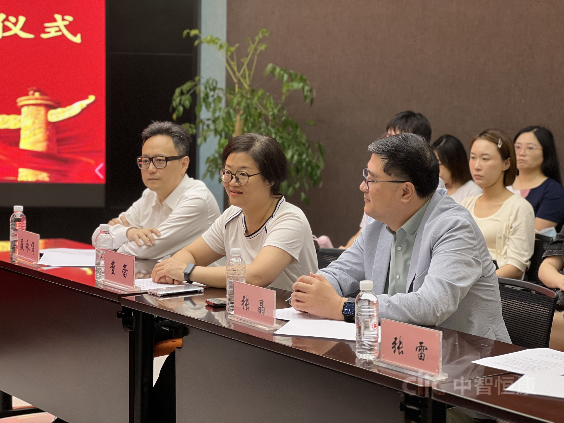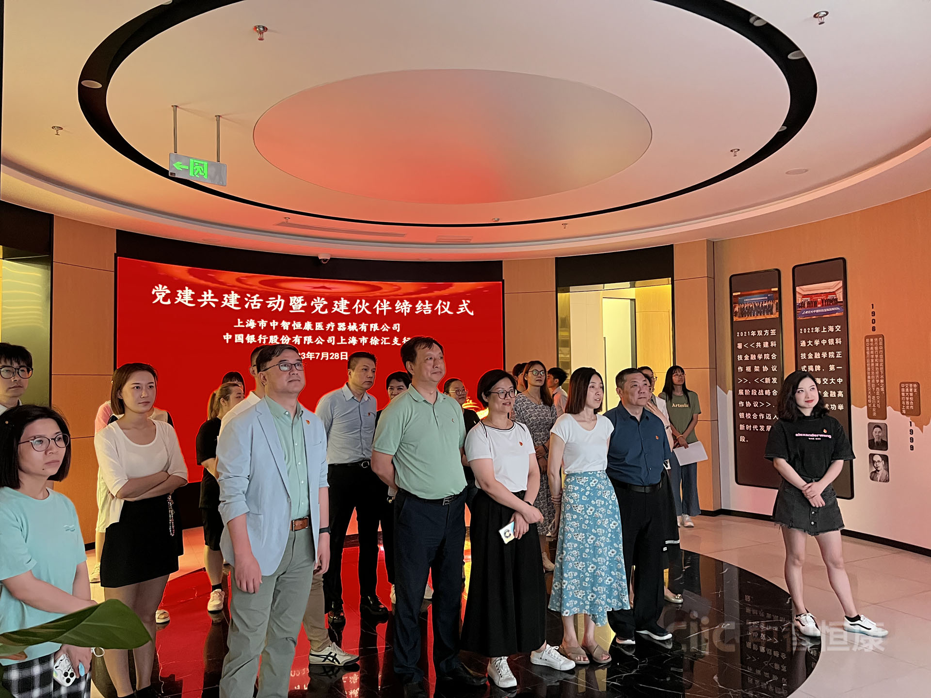 中行上海市徐汇支行党委委员、副行长杨震,中行上海市徐汇支行公司金融部党支部书记、主任蒋臻,中行上海市华泾支行党支部书记、行长谈小滢,中智恒康党支部书记、董事长、总经理张晶,中智恒康党支部委员、副总经理董蕾,中智恒康党支部委员、副总经理张雷,中智恒康党支部委员、总经理助理聂永隽,中智恒康党支部委员、质量总监郑伟民等双方支部在沪党员、积极分子参加了活动。