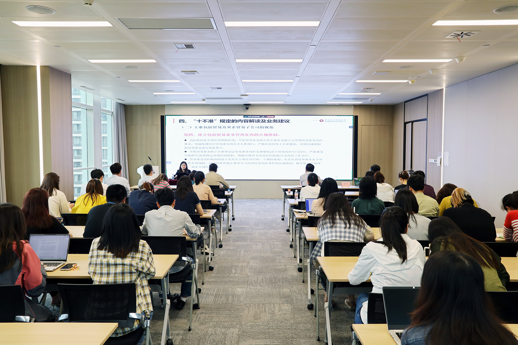 讲座现场,律师深入解读了国务院国资委贸易业务“十不准”规定,对融资性贸易常见业务模式和风险点把控做了详细解析,从法律专业层面分享了融资性贸易的识别路径,结合实际案例对规范业务流程及管理方面提出了建设性意见,为中央企业做好规避风险、合规运营的要求提供了思路。